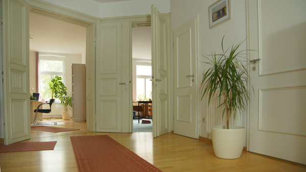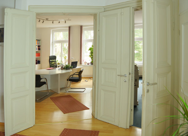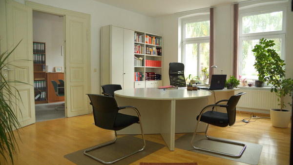 Auf den Fotos sehen Sie (von links nach rechts) eine Straßenansicht, die Eingangstür im 1.Stock, Flur, Arbeitszimmer sowie den Beratungsraum der Rechtsanwalt-Kanzlei.
